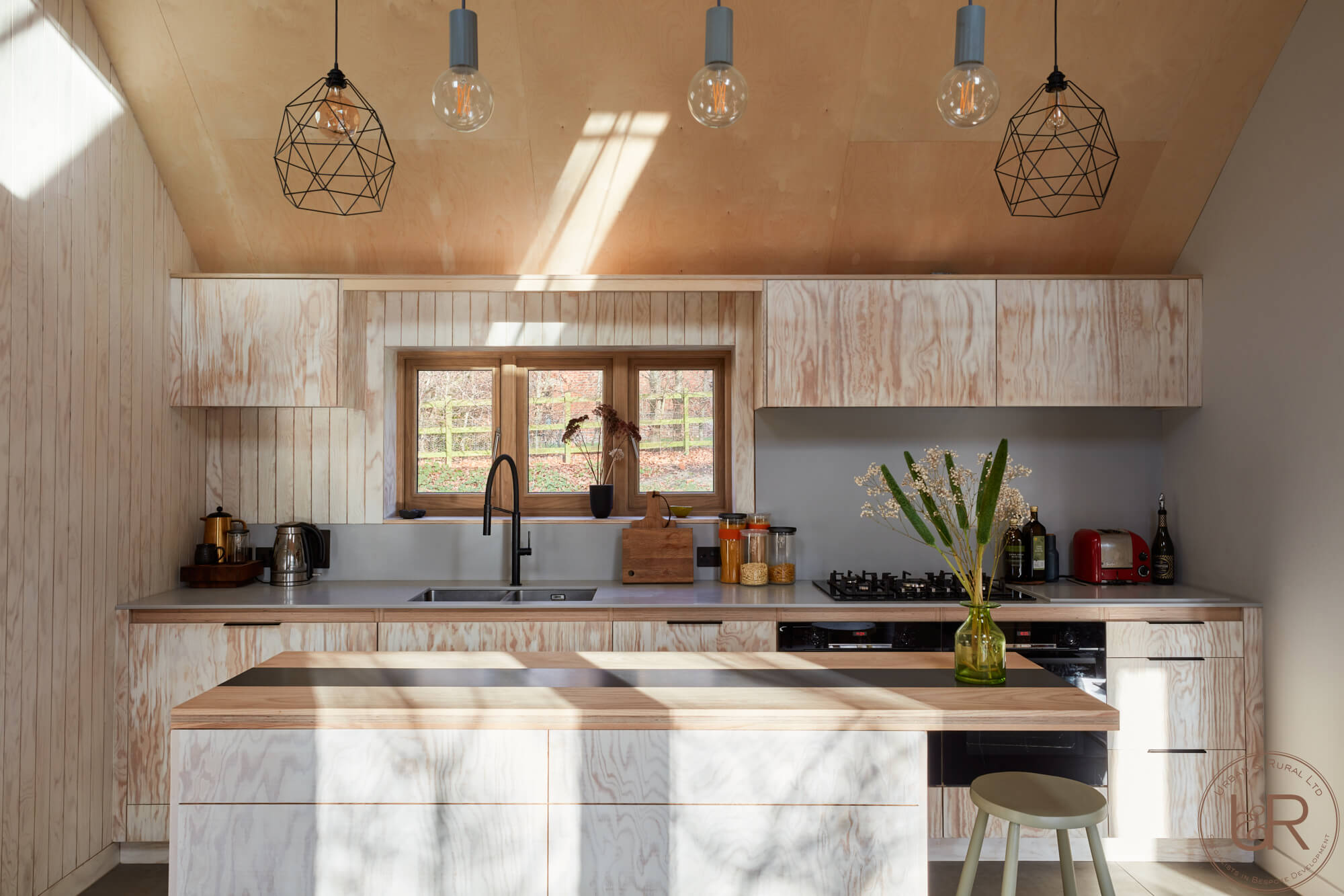 A scaffold temporary roof was erected over the property whilst we dismantled the roof structure and rebuilt following the redesign to form a vaulted ceiling space throughout the remodelled section of the barn. Internally the Works also included all associated new Electrical and mechanical services including a new heating system through the barn. A bespoke-built birch ply kitchen and utility room were installed within the new space and the birch ply theme was extended throughout the barn for ceiling and wall cladding.
